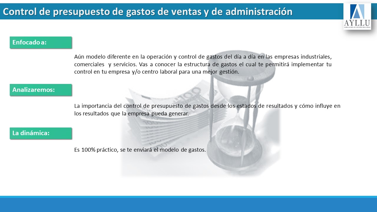 Este taller te permitirá entender la funcionalidad del control de presupuesto de gastos para que lo puedas aplicar en tu empresa y/o centro de trabajo.