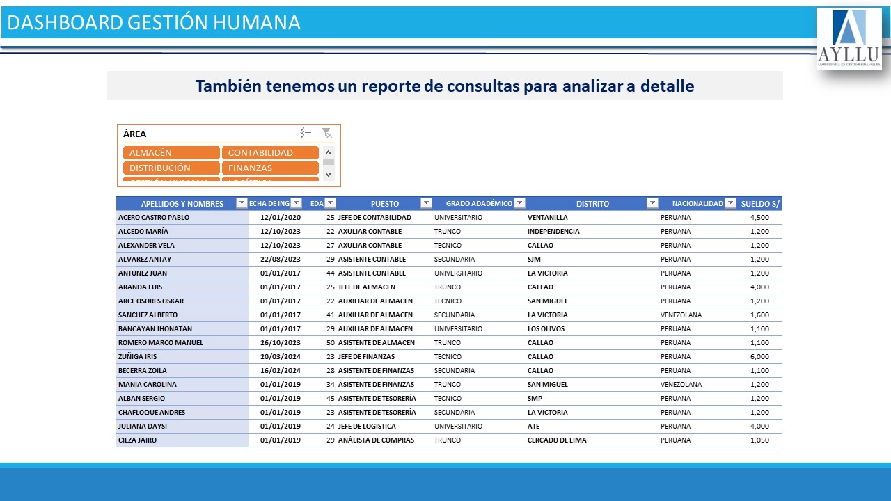 – Ranking de sueldos por área.