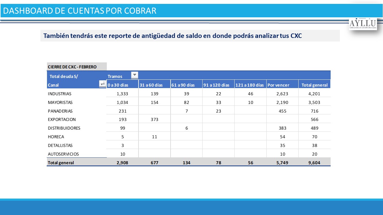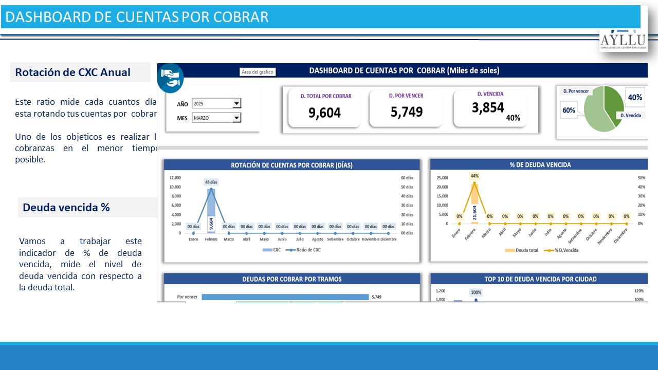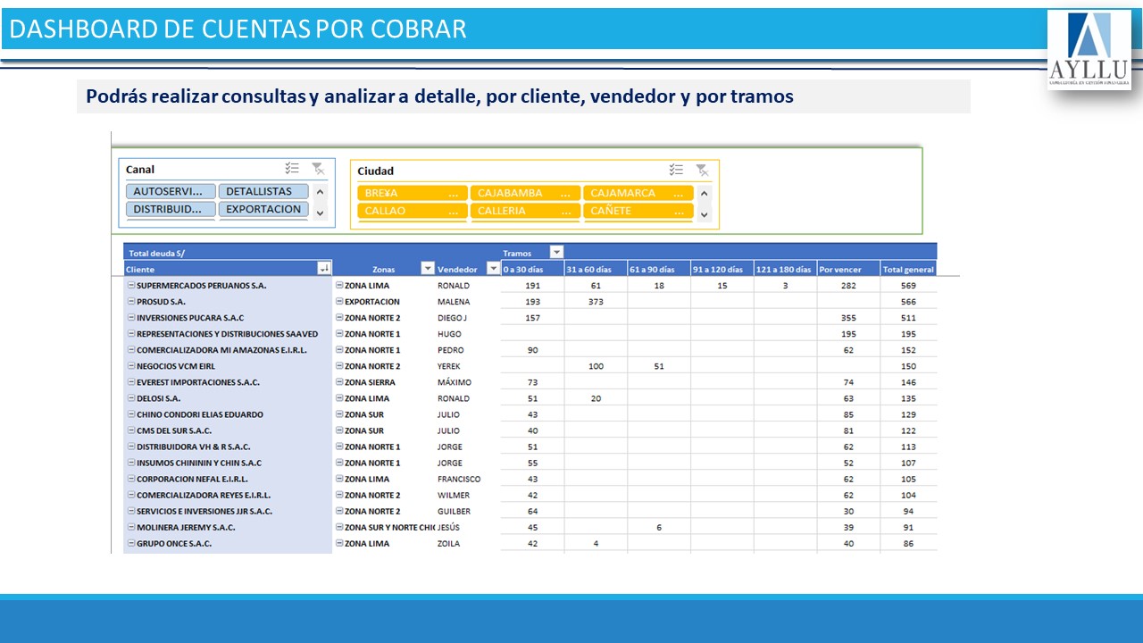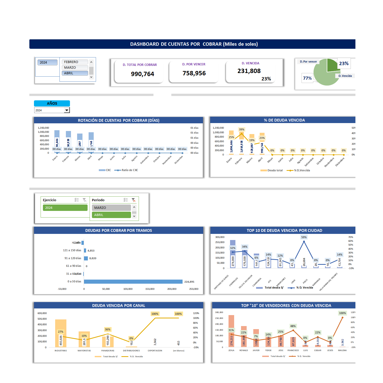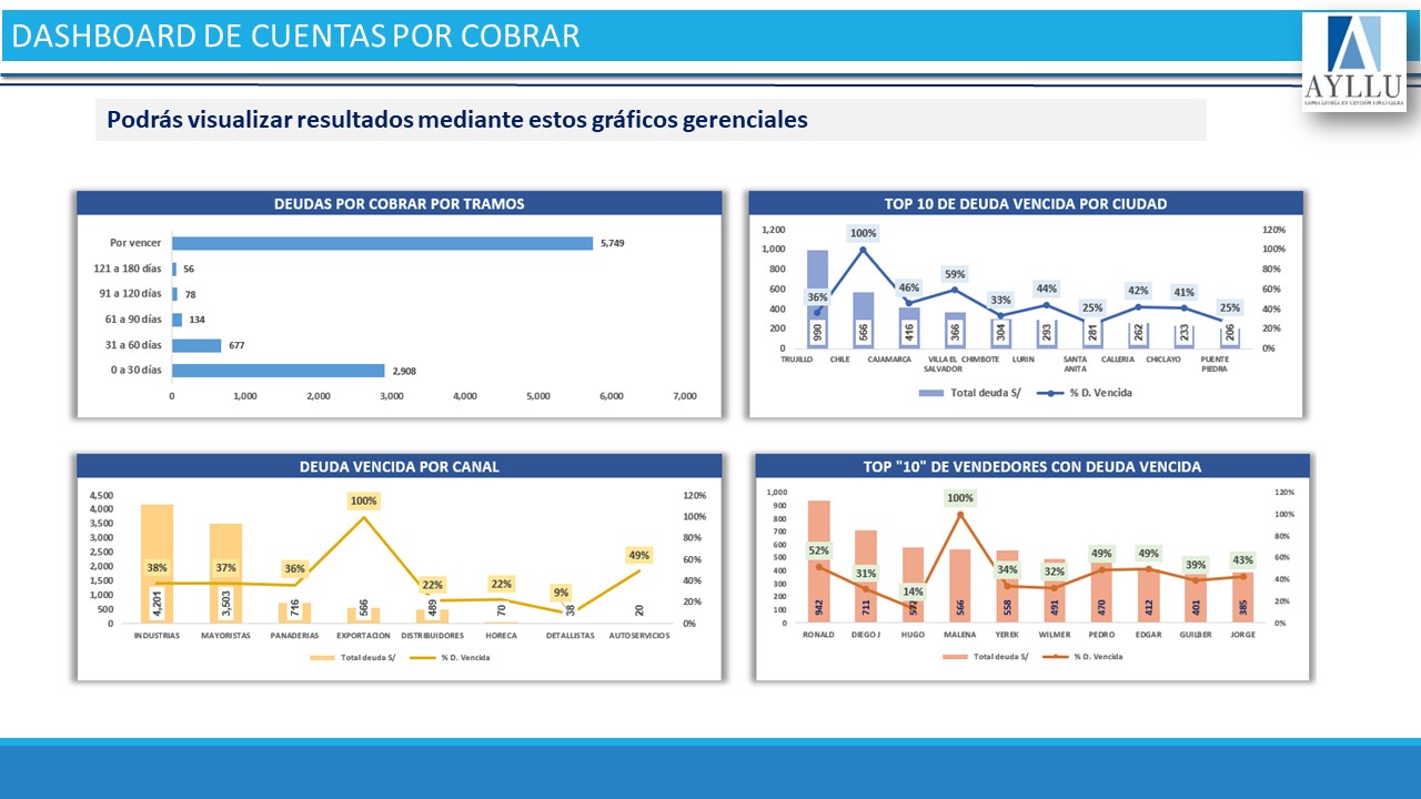 – % de deuda vencida por canal, clientes, ciudad y vendedores.