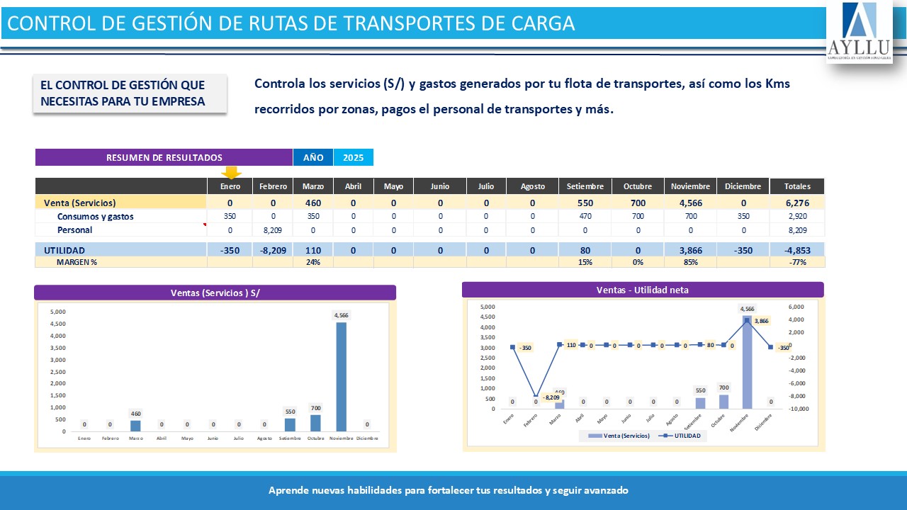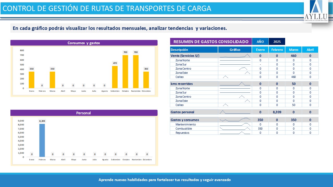 • Reporte general de resultado, en donde podrás visualizar información mensual, también tendrás gráficos mensuales en donde se visualizará información como: Ventas (Servicios), consumos y gastos, pago a personal (Operativo) y la utilidad aproximada que está generando las unidades de transporte.