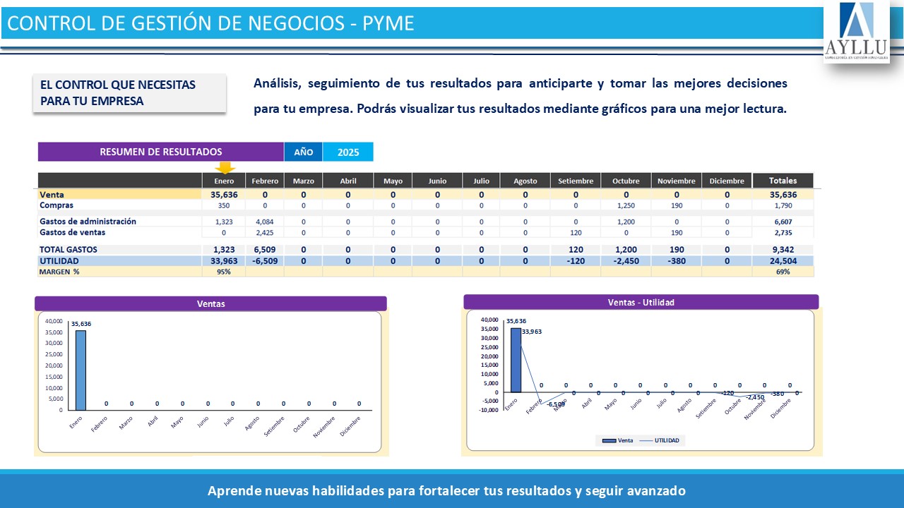 - Reporte general de resultado, en donde podrás visualizar información mensual, también tendrás gráficos mensuales en donde se visualizará información como: Ventas, compras, gastos operativos, pago a personal y la utilidad aproximada que se está generando.