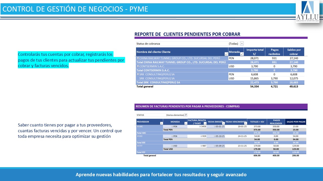 - Seguimiento de saldos de facturas por cobrar y por pagar.
